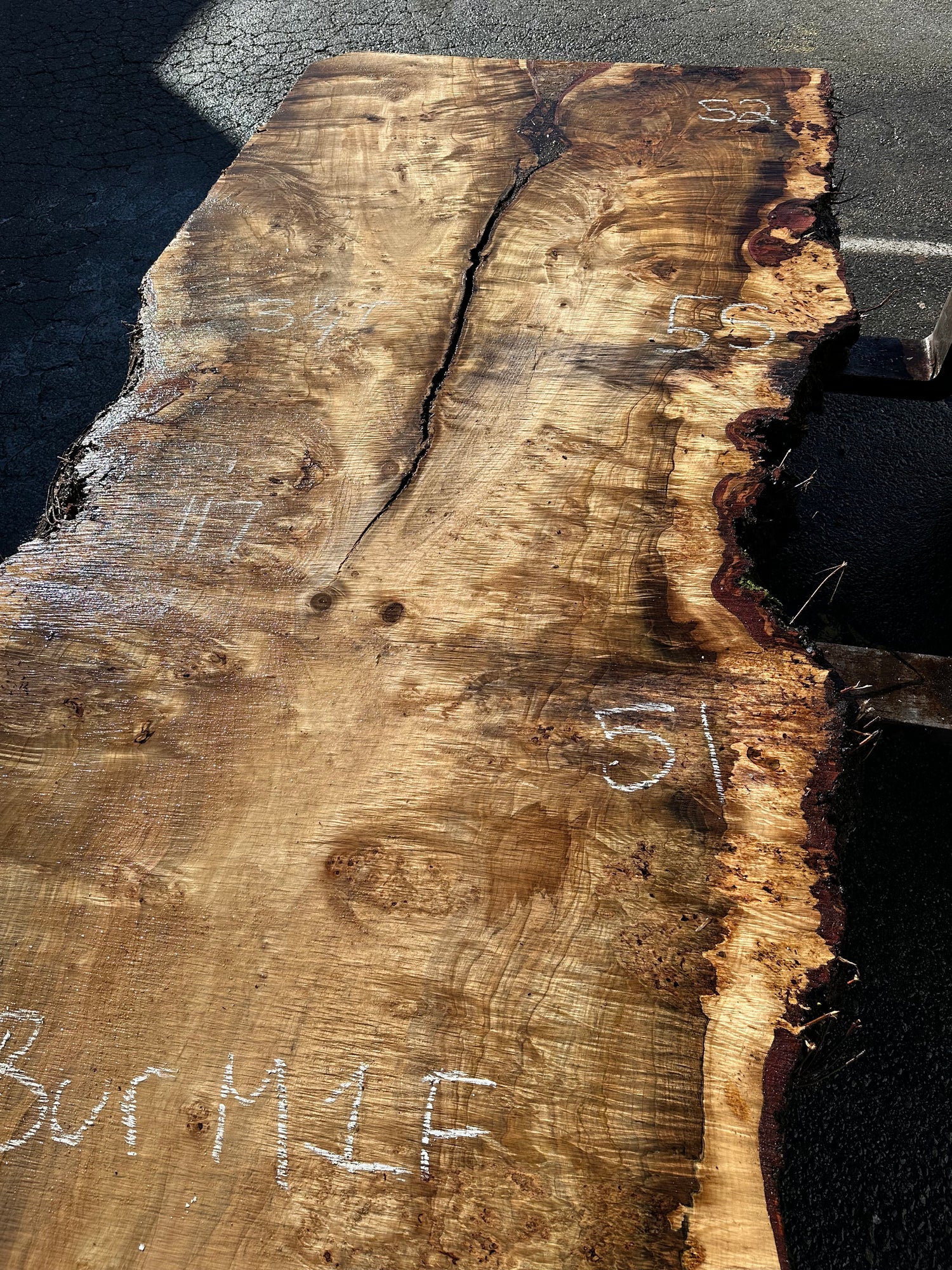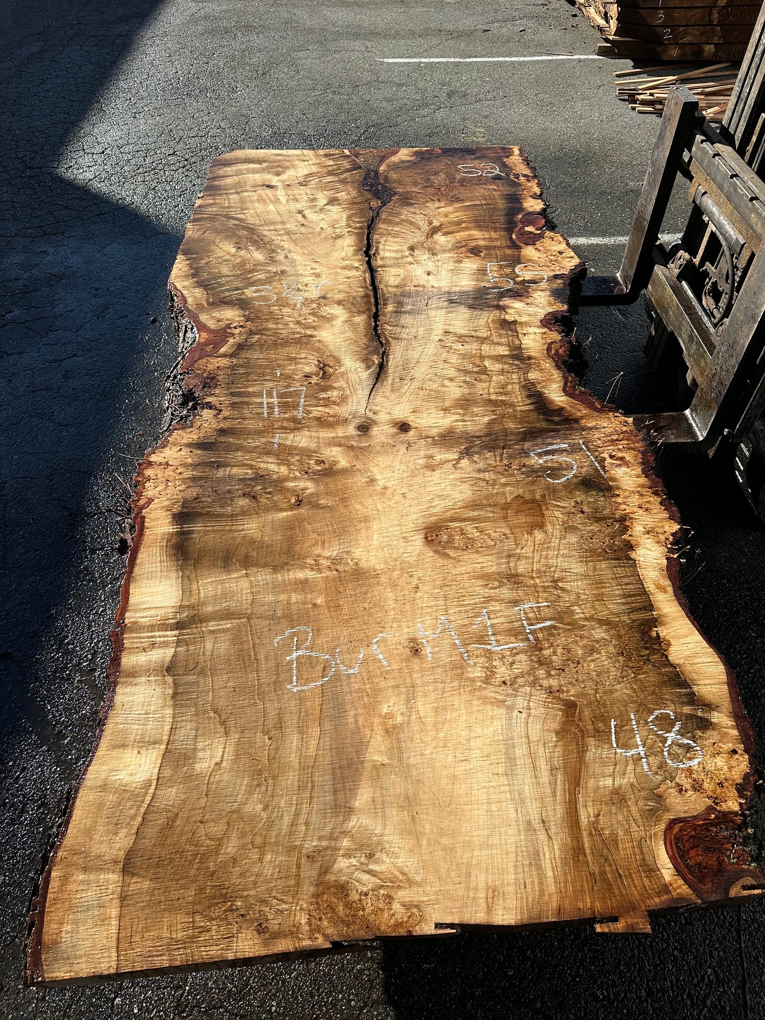 3 1/4 ”thick.This slab has lots of visible curl , flame and pin grain throughout the piece.