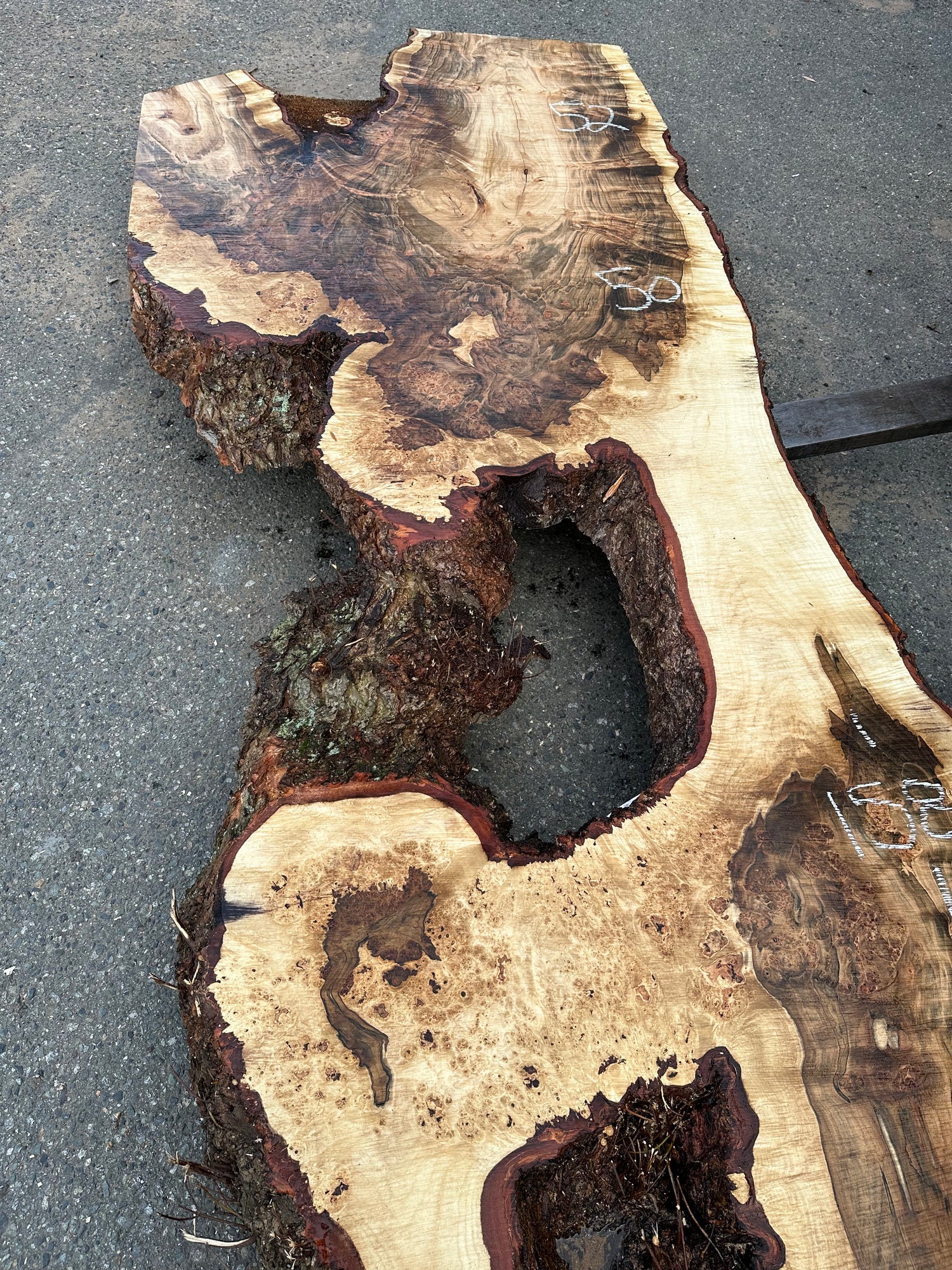 3 1/4” thick.This slab has lots of visible curl , flame and pin grain throughout the piece.