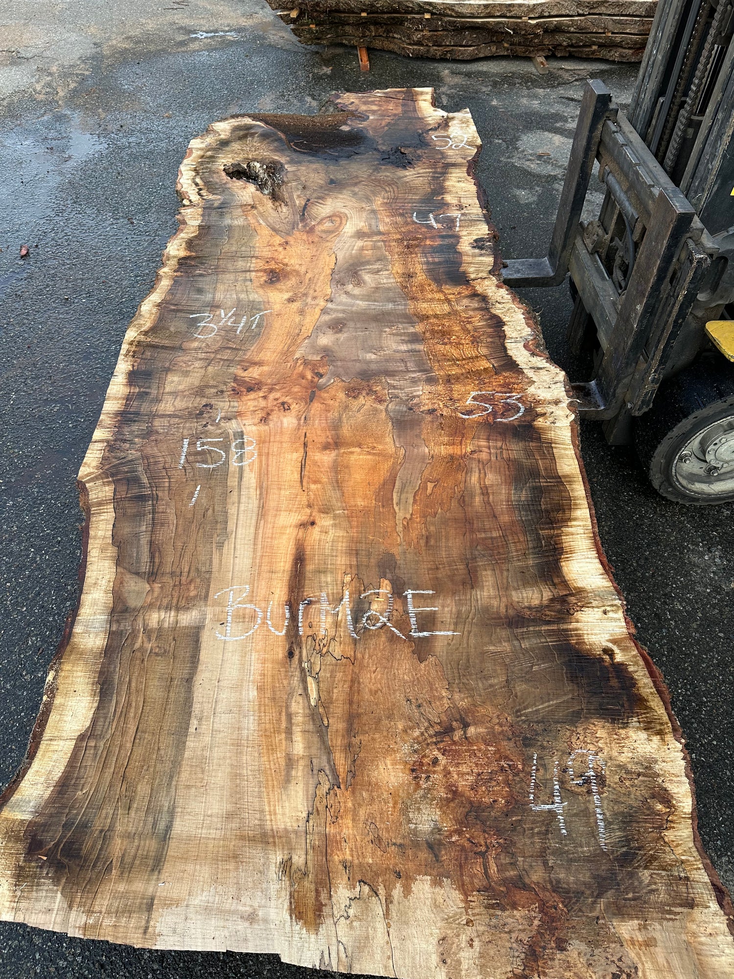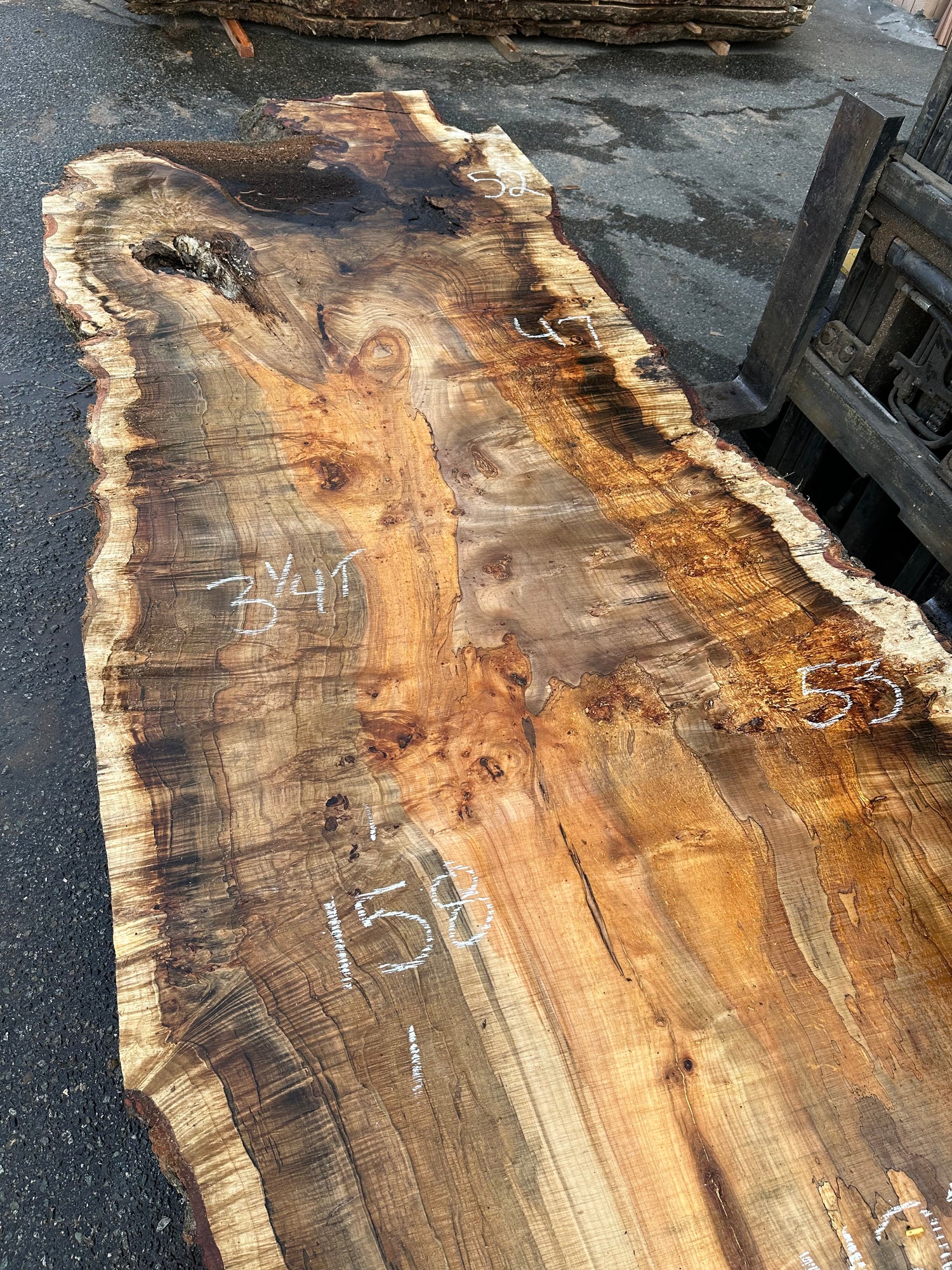 3 1/4” thick.This slab has lots of visible curl , flame and pin grain throughout the piece.