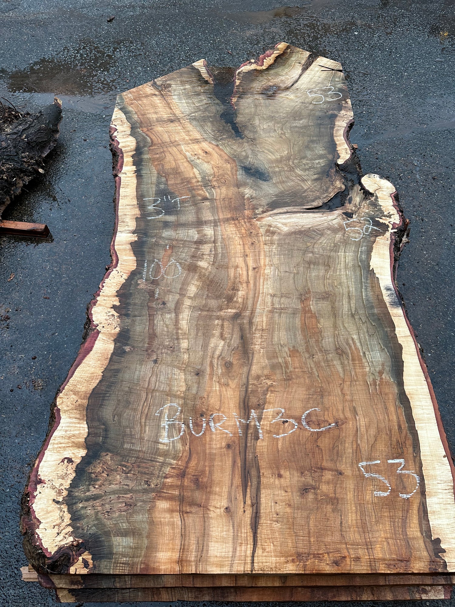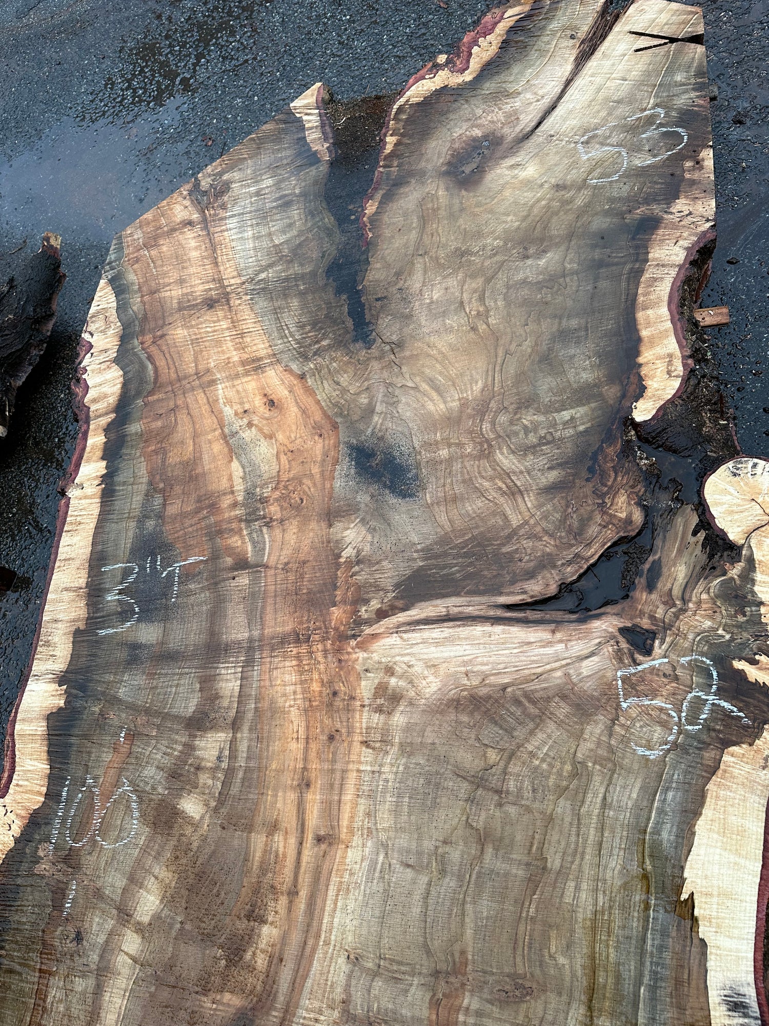 3 1/2” thick. This slab has lots of visible curl , flame and pin grain throughout the piece.