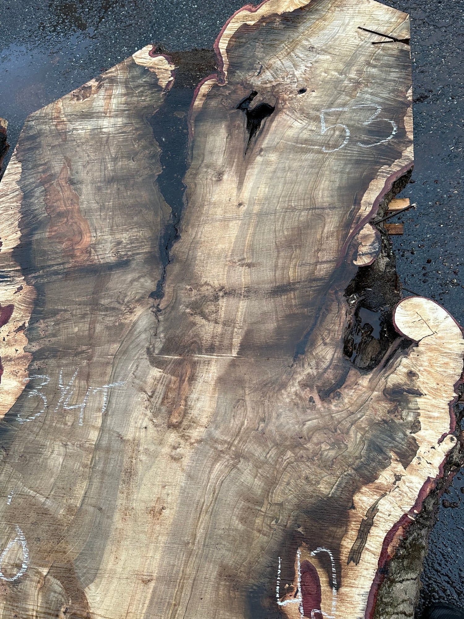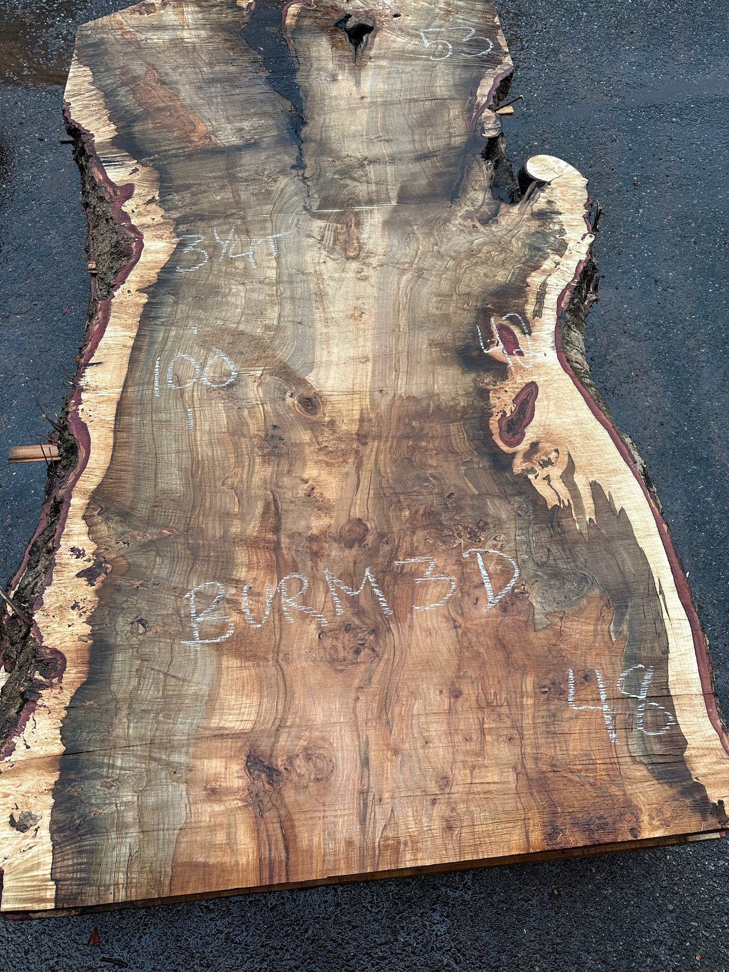 3 1/4” thick. This slab has lots of visible curl , flame and pin grain throughout the piece.