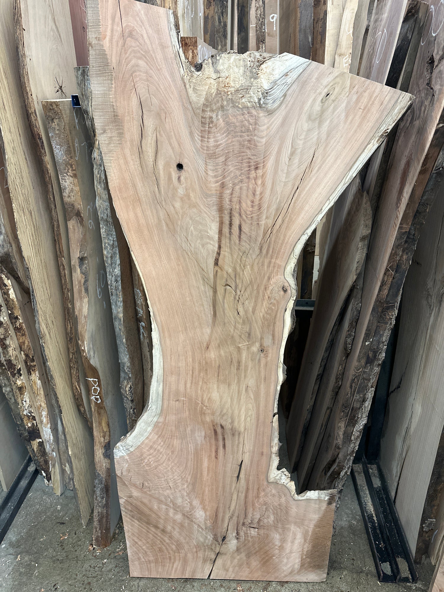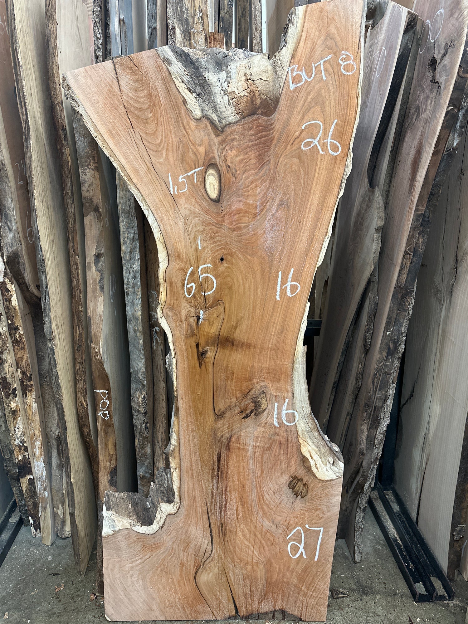 1.5” thick . This piece has curly grains , some softer outer edges , surface cracks.