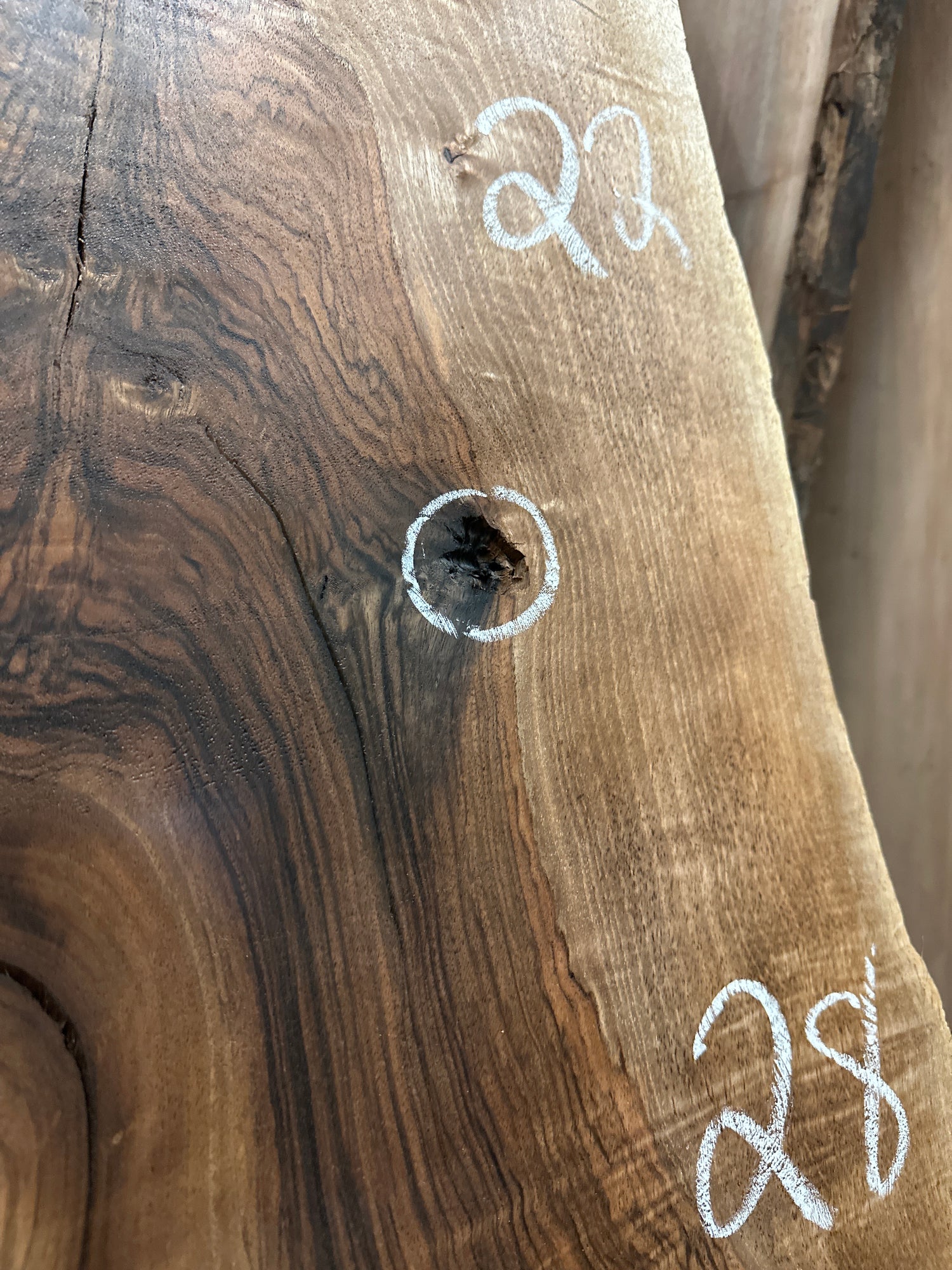 1 3/8” thick- some surface cracks and curl are visible . Circles represent a previously removed nail which now has some light surface damage