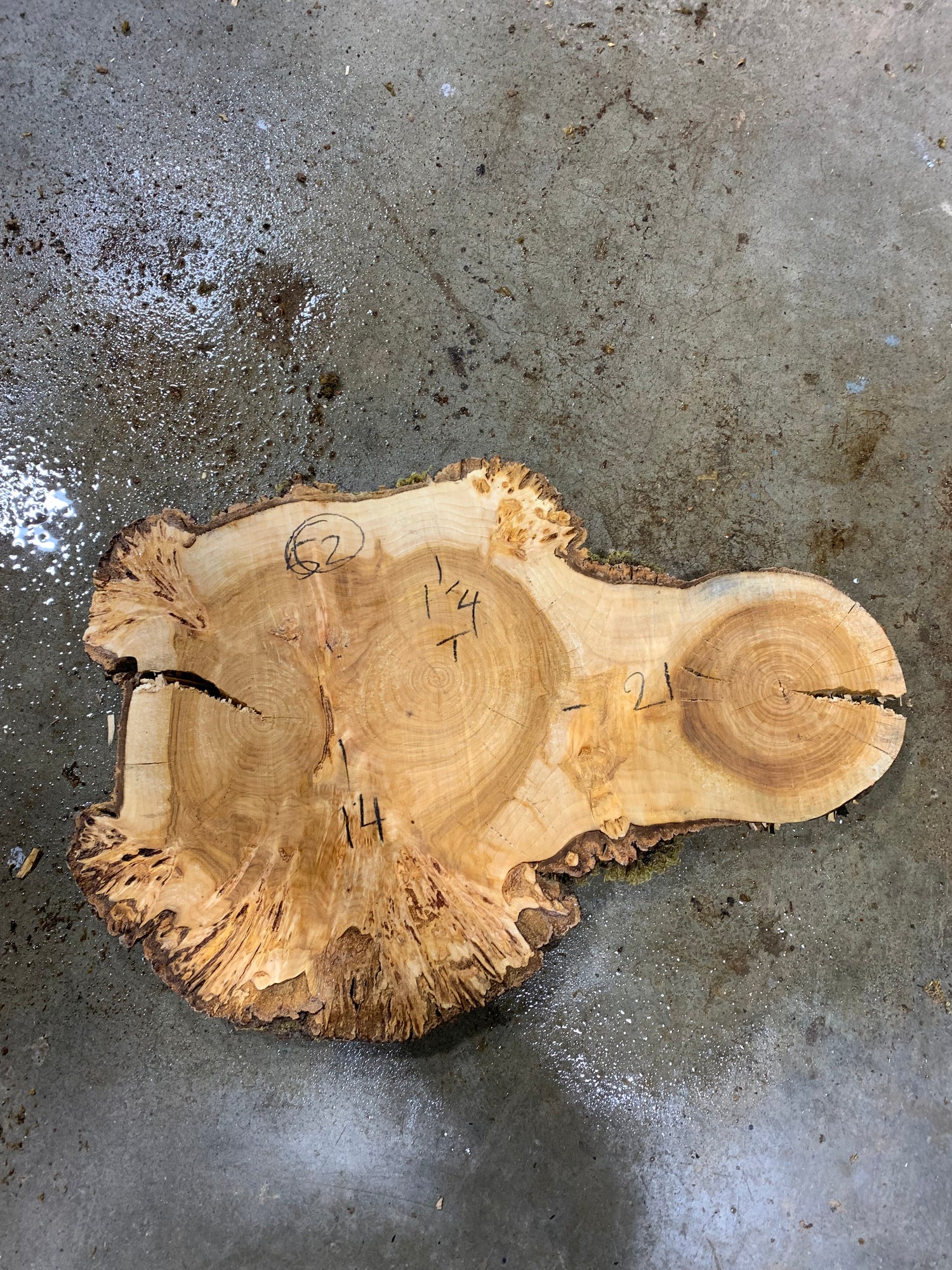 These rounds have amazing color tones with visible burls . Product number , dimensions and thickness are written on each piece.